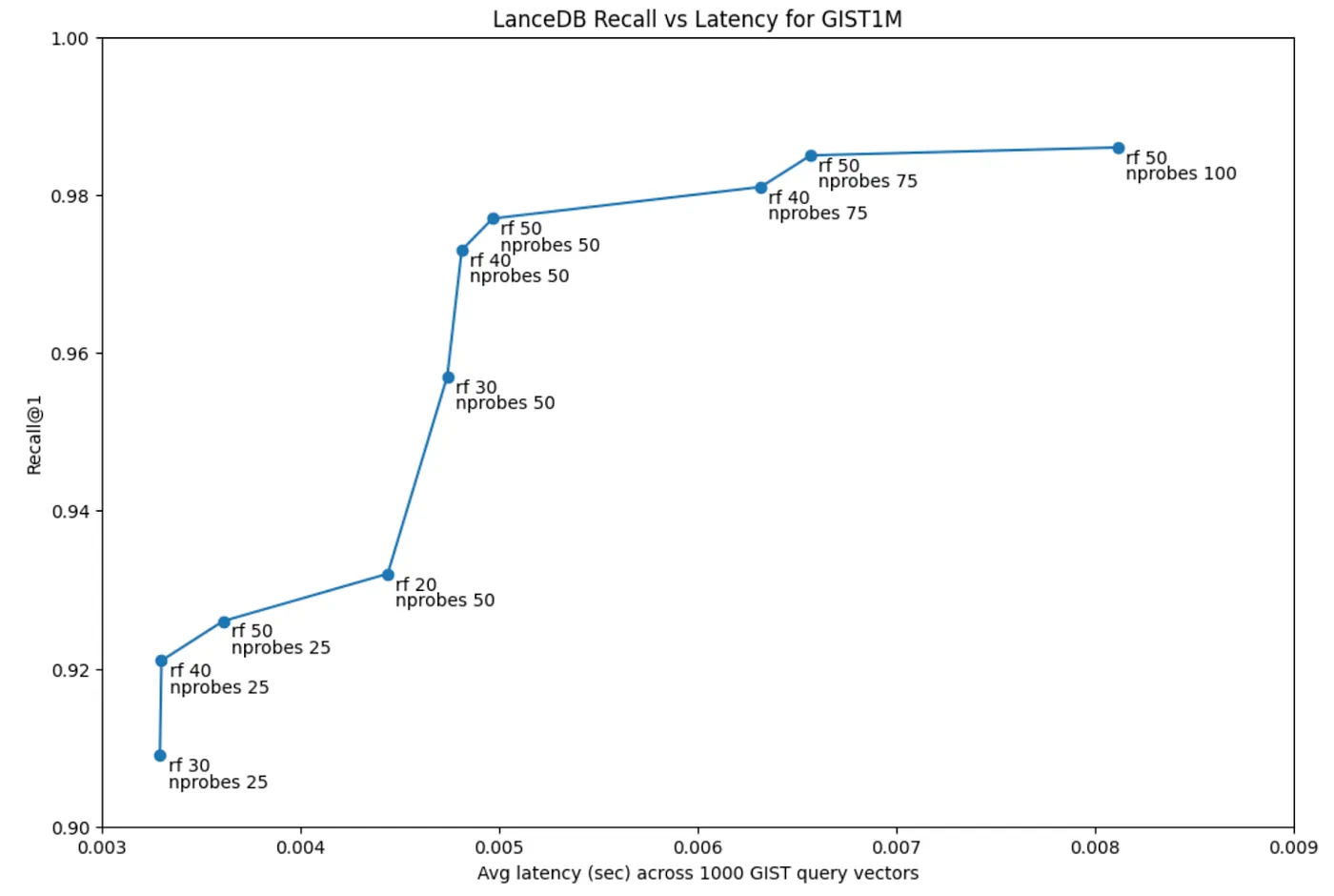 . In our benchmark on the GIST-1M dataset, we show that it’s possible to achieve >0.95 recall with a latency of under 10 ms on most systems, using ~50 probes and a refine_factor